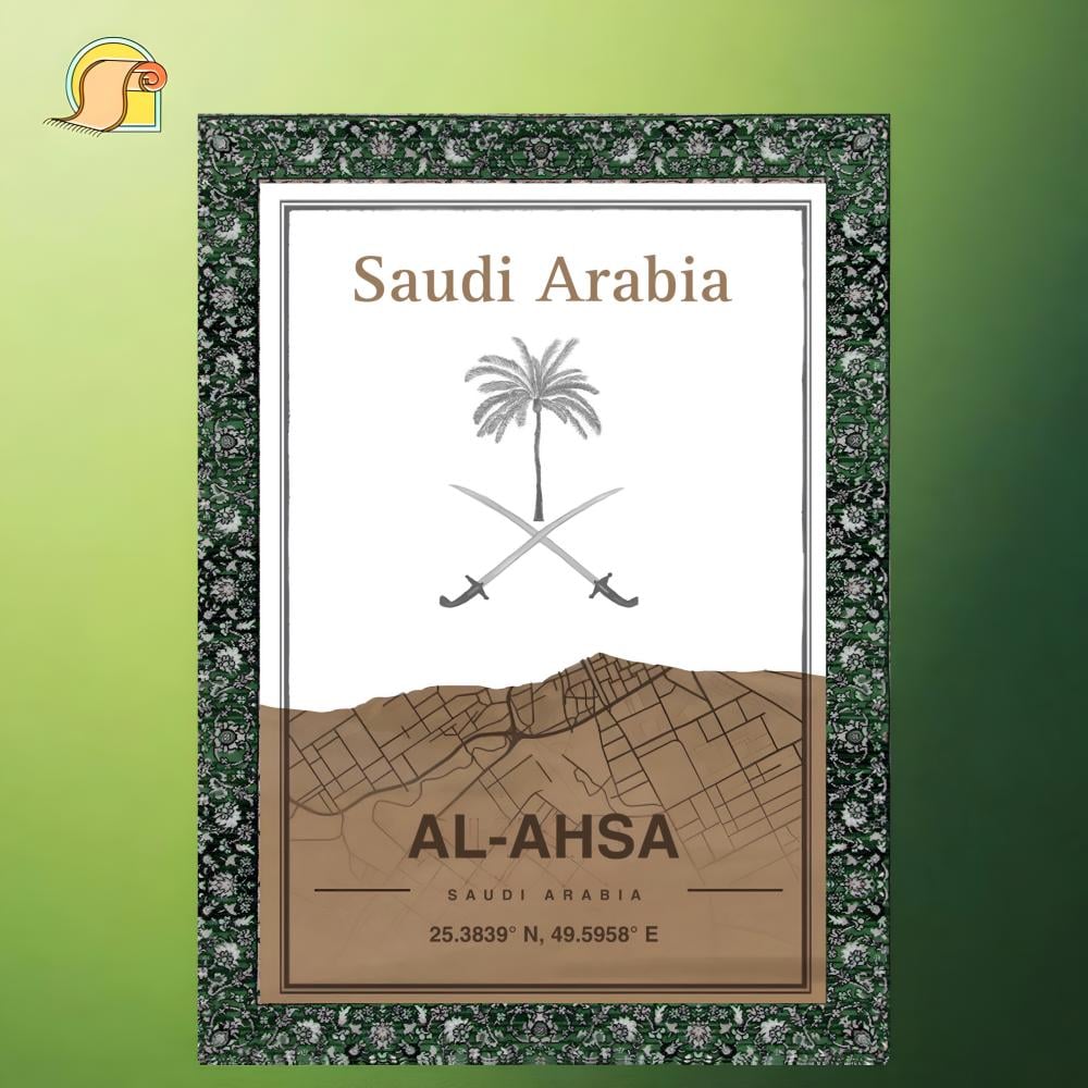 هذا التصميم يعبر عن منطقة الأحساء بأسلوب أنيق يمزج بين الهوية الوطنية والطابع الجغرافي. في الجزء العلوي، يتوسط التصميم شعار المملكة العربية السعودية المكون من نخلة وسيفين متقاطعين، وهو رمز يعبر عن النمو والازدهار والقوة.