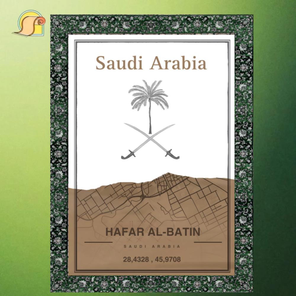 هذا التصميم يعبر عن حفر الباطن بأسلوب أنيق يمزج بين الهوية الوطنية والطابع الجغرافي. في الجزء العلوي، يتوسط التصميم شعار المملكة العربية السعودية المكون من نخلة وسيفين متقاطعين، وهو رمز يعبر عن النمو والازدهار والقوة.
