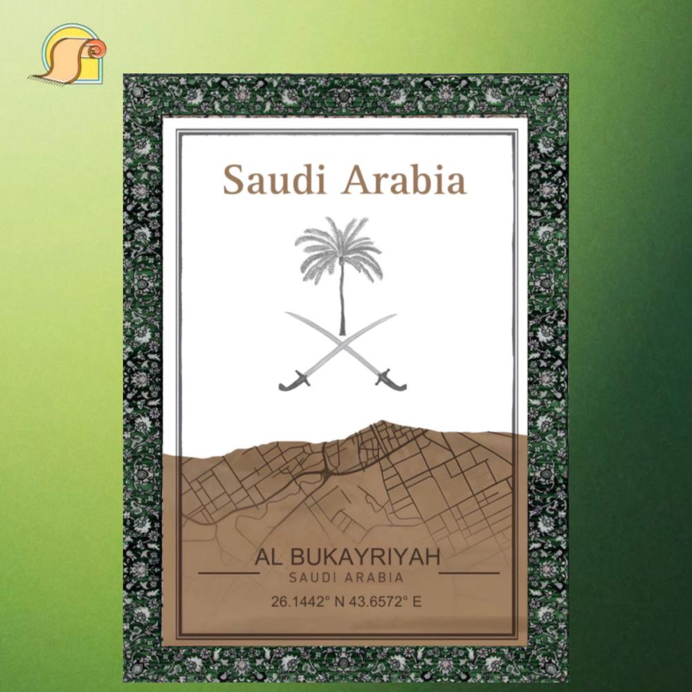 هذا التصميم يعبر عن منطقة البكيرية بأسلوب أنيق يمزج بين الهوية الوطنية والطابع الجغرافي. في الجزء العلوي، يتوسط التصميم شعار المملكة العربية السعودية المكون من نخلة وسيفين متقاطعين، وهو رمز يعبر عن النمو والازدهار والقوة.